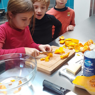 Nathalia, Hanène, Amel, Sylvain et Clara ont aidé les enfants à préparer un succulent risotto de butternut, un savoureux gratin de pomme de terre et patate douce et une délicieuse tarte aux pommes !